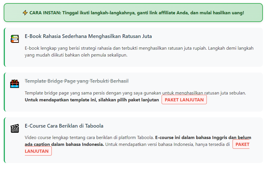 Template bridge page yang sama persis dengan yang saya gunakan untuk menghasilkan ratusan juta sebulan. Untuk mendapatkan template ini, silahkan pilih paket lanjutan PAKET LANJUTAN